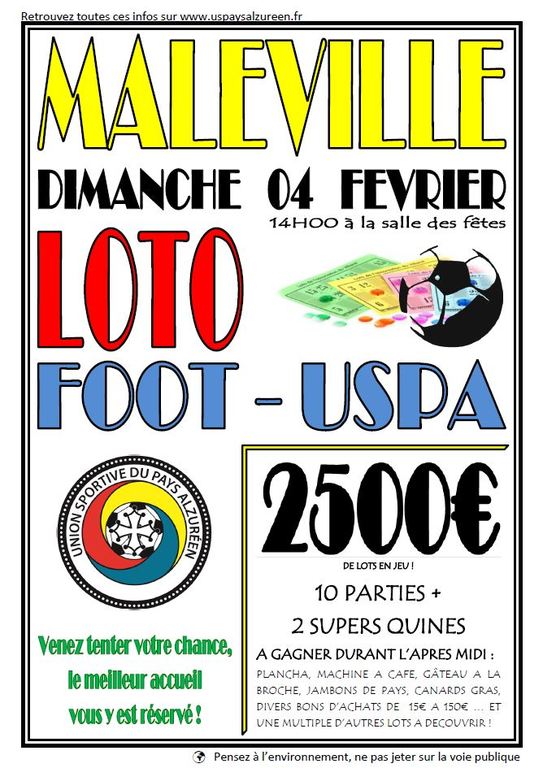 L'UNION SPORTIVE du PAYS ALZUREEN vous acceuille DIMANCHE 04 FEVRIER 2018 à la salle des fêtes de MALEVILLE à partir de 14H00. Début de la partie à 14H30 !