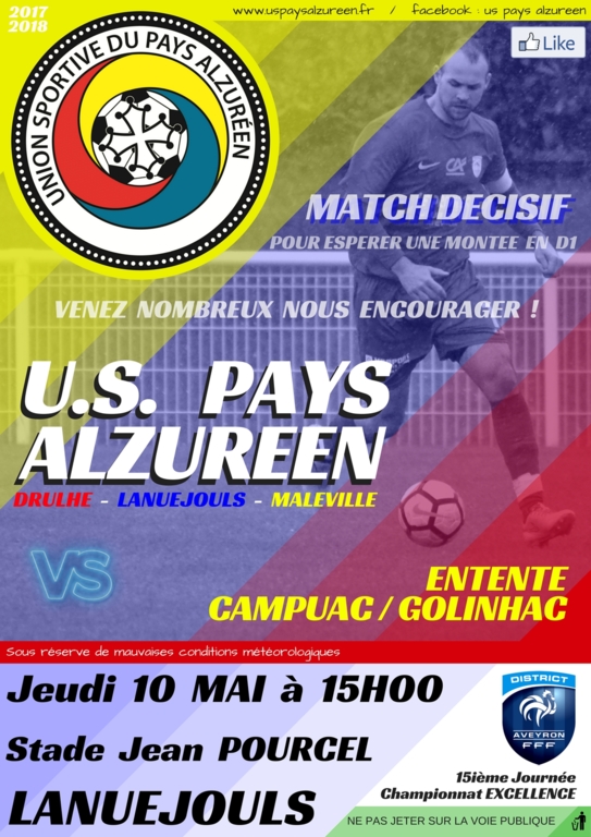 Jeudi 10 MAI, notre équipe fanion reçoit l'entente CAMPUAC/GOLINHAC pour le compte de la 15ième journée de championnat, journée reprogrammée suite au bon parcours de nos Alzuréens en coupe d'AVEYRON. C'est un match important et la victoire est impérative face à un concurrent direct à la montée en D1 !
